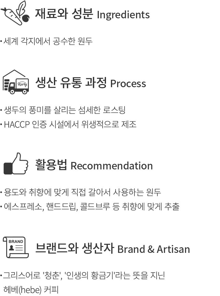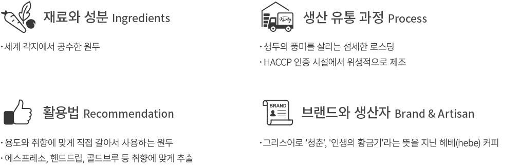 헤베커피는 최근 커피 씬에서 주목하고 있는 스페셜티 커피 매장으로,서울시 중구에 위치하고 있어요. 헤베커피의 오너인 임지영 바리스타는 한국 브루어스컵 국가대표 선발전 등 다양한 대회의 수상 경력을 지닌 실력 있는 바리스타인데요. 그는 매장을 찾는 손님들께 푸르른 봄과 같은 활력을 공유하고 싶다는 마음에서 가게 이름을 그리스어로 '청춘','인생의 황금기'라는 의미의 'hebe'라 지었답니다. 다양한 채널을 통해 고객과의 소통을 이어나가고자 하는 헤베커피를 이제 컬리에서 만나보세요.