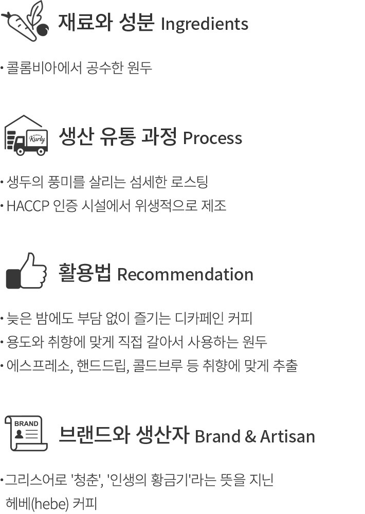 헤베커피는 최근 커피 씬에서 주목하고 있는 스페셜티 커피 매장으로,서울시 중구에 위치하고 있어요. 헤베커피의 오너인 임지영 바리스타는 한국 브루어스컵 국가대표 선발전 등 다양한 대회의 수상 경력을 지닌 실력 있는 바리스타인데요. 그는 매장을 찾는 손님들께 푸르른 봄과 같은 활력을 공유하고 싶다는 마음에서 가게 이름을 그리스어로 '청춘','인생의 황금기'라는 의미의 'hebe'라 지었답니다. 다양한 채널을 통해 고객과의 소통을 이어나가고자 하는 헤베커피를 이제 컬리에서 만나보세요.