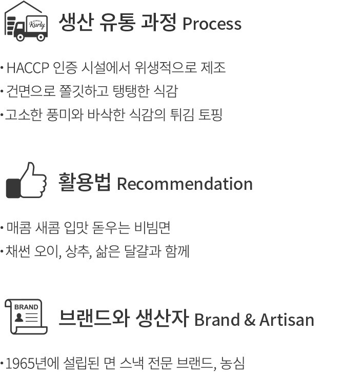 달달한 배와 매콤한 홍고추,시원한 동치미의 맛이 맛깔 나는 농심 배홍동. 핵심 재료의 앞글자를 따서 이름을 붙인 재치부터 많은 이목을 끌었는데요. 건면으로 새로운 식감까지 더한 배홍동 쫄쫄면을 만나보세요. 쫄면처럼 쫄깃하고 탱탱한 면발이 새콤달콤한 양념장과 조화롭게 어우러진답니다. 후첨 튀김 토핑은 바삭한 식감과 고소한 풍미를 더해주니,가장 마지막에 솔솔 뿌려 곁들여보세요.