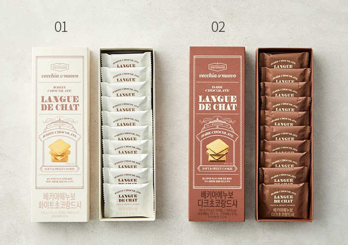 신세계의 레스토랑 &베이커리 카페 브랜드,베키아에누보의 랑드샤를 만나 보세요. 랑드샤는 ‘고양이의 혀’를 뜻하는 프랑스어로,납작하고 모서리가 둥근 과자를 뜻해요. 베키아에누보는 부드러운 화이트 초콜릿 랑드샤와 달콤쌉쌀한 다크 초콜릿 랑드샤를 준비했답니다. 취향에 따라 선택해 보세요. 아메리카노와 함께 즐기면 오후의 디저트로 손색이 없을 거예요.