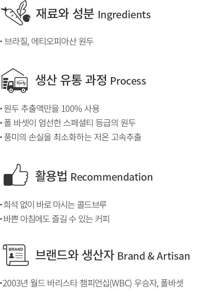 늦은 밤에도 희석 없이 바로 마실 수 있는 콜드브루를 찾고 있다면,폴바셋의 콜드브루 디카페인을 만나보세요. 폴 바셋이 까다롭게 엄선한 브라질,에티오피아산 원두를 사용했는데요. 저온 고속추출으로 원두 풍미의 손실을 최소화했답니다. 오로지 원두 추출액만을 담았기에 맛과 향을 제대로 만끽할 수 있지요. 바쁜 아침에도 여유로운 커피 타임을 즐겨 보세요.