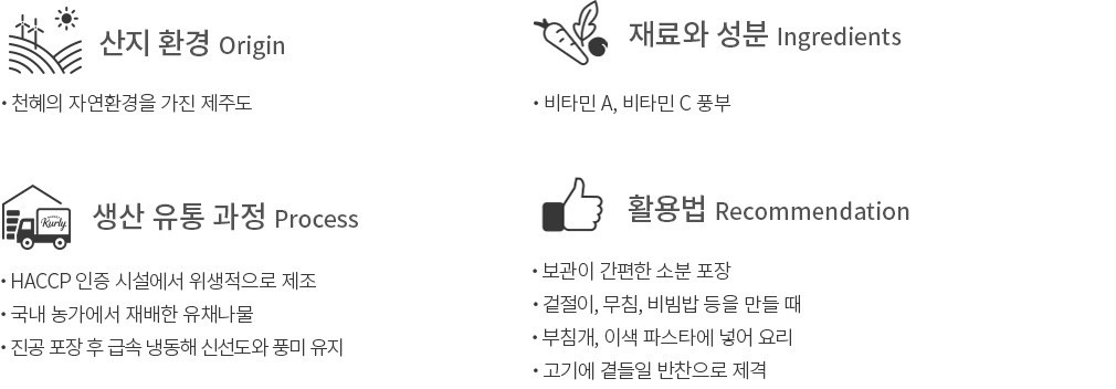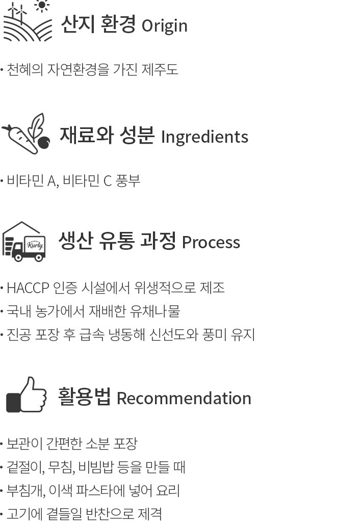 화들짝 피어난 유채꽃이 반갑게 느껴질 때쯤 봄이 성큼 다가왔음을 알게 되죠. 이번에는 제주에서 자란 유채꽃의 새순,유채나물을 소개할게요. 싱싱한 유채나물을 채취한 직후,뜨거운 물에 데치고 냉동했기에 신선함이 오롯이 살아있어요. 씹을수록 달콤 쌉싸름한 맛이 느껴지면서 입안 가득 향긋한 봄 내음이 퍼진답니다. 두 팩으로 나눠 보내드리니,산뜻하게 입맛을 돋워줄 반찬으로 만들어 보세요.