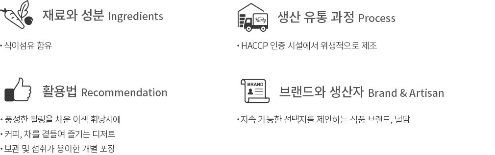 환경과 사회,건강을 생각한 더 나은 선택지를 제안하는 널담을 만나보세요. 지금 소개할 뚱낭시에는 두꺼운 크림 필링을 채워 완성한 이색 휘낭시에입니다. 쫀득한 식감이 매력적인 휘낭시에를 반으로 갈라 각양각색의 필링을 채워 풍성한 달콤함을 자랑해요. 단짠매력의 황치즈부터 향긋한 매력의 무화과크림치즈 등 8가지 종류로 구성해 다채로운 매력을 맛볼 수 있답니다. 개별 포장된 휘낭시에를 하나씩 해동해 즐겨보세요. 커피나 차를 곁들여 즐기는 디저트로도 참 좋을 거예요.