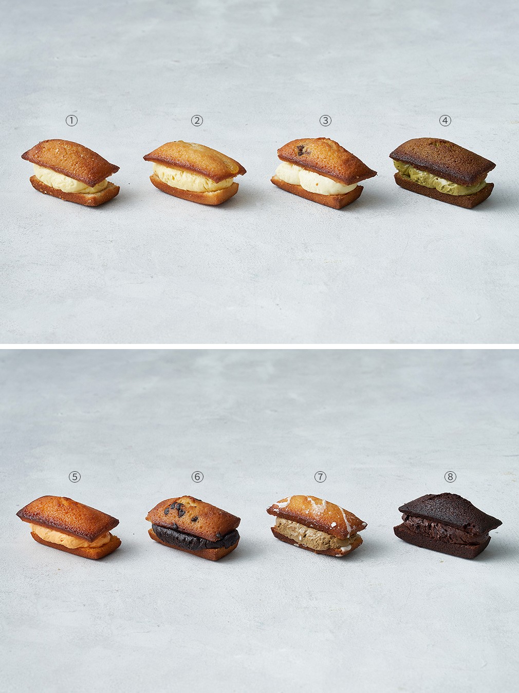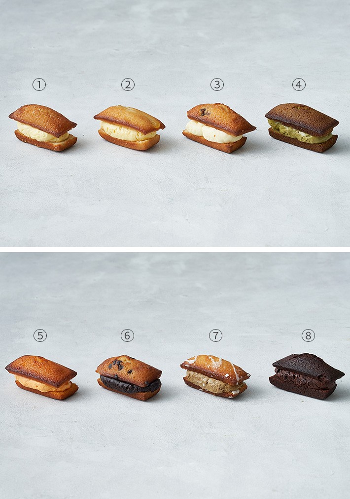 뚱낭시에 8구 세트・구성:①솔티드바닐라,②군고구마,③무화과크림치즈,④녹차커스터드,⑤황치즈,⑥초코칩,⑦레몬얼그레이,⑧다크초콜릿 각 1개입