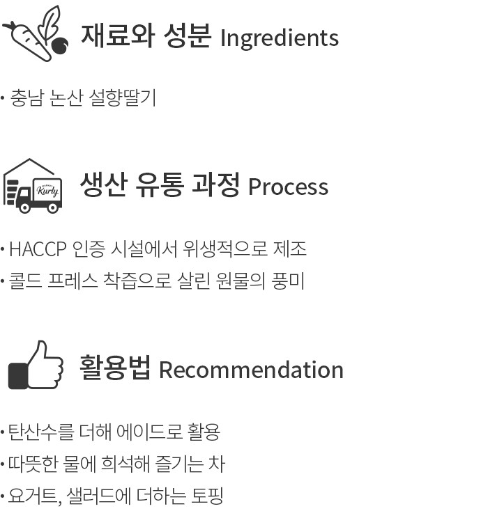 콜드 프레스 착즙 공법으로 원물 본연의 풍미를 살린 프루티프루티의 수제청을 만나보세요. 지금 만나볼 딸기수제청은 논산의 설향 딸기를 사용해 더욱 특별해요. 설향이 지닌 진한 달콤함이 한 병 가득 담겨있지요. 백설탕으로 은은한 단맛을 더한 것은 물론,깨끗하게 손질한 과육을 더해 진한 맛과 풍성한 식감까지 놓치지 않았답니다. 따뜻한 물에 타서 차로 즐기는 것은 물론,탄산수에 희석해 에이드를 만들어 보세요. 요거트나 샐러드에 더하는 포인트 토핑으로도 제격일 거예요.