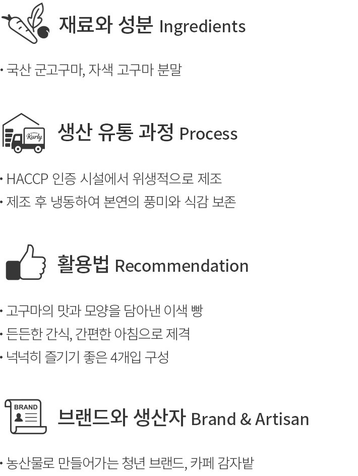 카페 감자밭이 선보이는 군고구마빵을 컬리에서 만나 보세요. 쌀가루를 넣어 쫀득하게 완성한 빵에 국산 군고구마를 가득 채워 완성했답니다. 살짝 데워서 간편한 아침 혹은 이색 디저트로,취향에 따라 다양하게 즐겨 보세요.