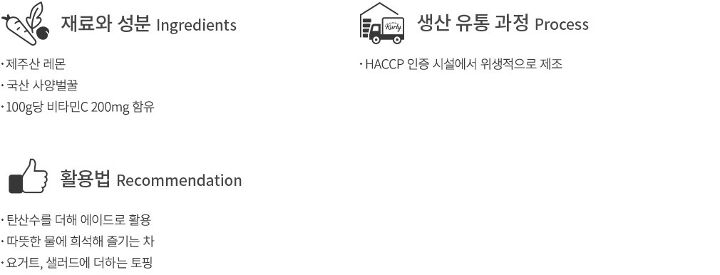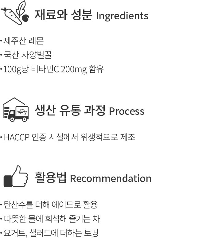 자임이 선보이는 제주레몬 티&에이드를 만나보세요. 제주산 레몬을 그대로 갈아 새콤하면서도 달큰한 맛과 향이 오롯이 전해져요. 100g당 비타민C 200mg을 함유하고 있지요. 따뜻한 물과 함께 차로 마셔도 좋고,탄산수에 희석해 에이드로 즐겨도 제격이랍니다.