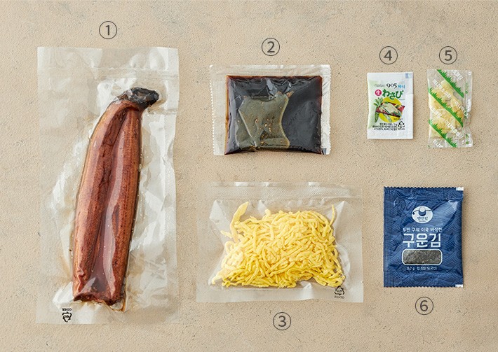 ・구성:①양념장어,②덮밥 소스,③계란지단,④생와사비,⑤초생강,⑥구운 김
