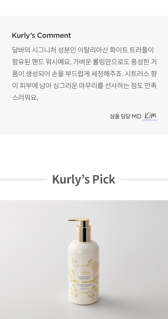 ・ 특징:이탈리아산 화이트 트러플이 함유된 핸드워시예요. 장미와 소나무 향 베이스에 시원하고 달콤한 시트러스 향이 어우러지며 은은하게 남아요.