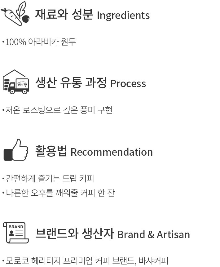 모로코 헤리티지 프리미엄 커피 브랜드,바샤커피의 싱글 오리진 드립백을 소개할게요. 에티오피아,케냐 등 세계적인 원두 산지에서 수확한 아라비카 원두만을 사용해 저온에서 로스팅했습니다. 각기 다른 매력의 5가지 드립백 중 취향에 따라 골라보세요. 원두 본연의 복합적이고 다채로운 풍미를 제대로 경험할 수 있을 거예요.