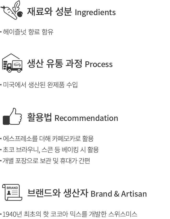 전 세계에 수많은 마니아를 보유하고 있는 핫코코아 브랜드,스위스미스의 초콜릿 헤이즐넛을 만나 보세요. 밀크초콜릿 맛 코코아에 헤이즐넛 향을 더해 달달하면서도 고소한 풍미를 완성했어요. 텁텁함이 적어 부드럽게 마시기 좋답니다. 개별 포장되어 있으니,한 포씩 꺼내 핫초코나 아이스 초코로 즐겨 보세요.