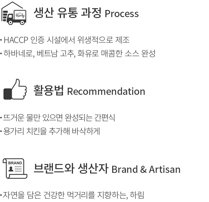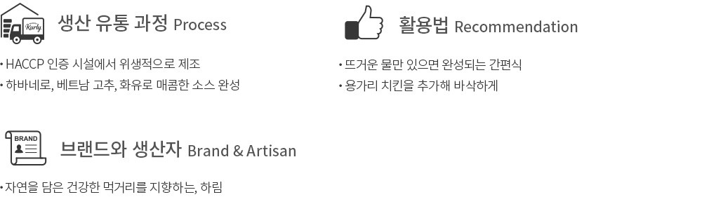 어린 시절 ‘추억의 반찬’ 하면 바로 떠오르는 제품이 있지요. 하림의 용가리가 볶음면과 만나 화끈하게 돌아왔습니다. 칼칼한 베트남 고추와 화유에 향긋한 하바네로를 넣어 감칠맛 나는 소스를 완성했어요. 용가리 어묵을 찾아 매콤한 면과 함께 먹는 재미도 있을 거예요.