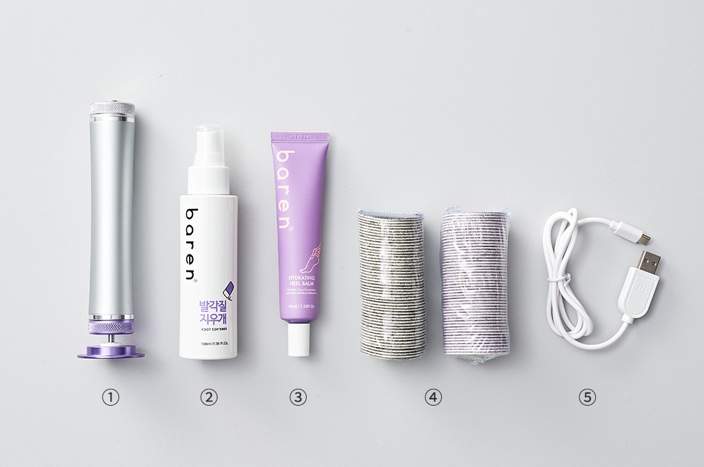 - 구성 :①전동 발각질제거기,②발각질지우개 연화제 1개(100mL),③하이드레이팅 힐밤 1개(40mL),④사포 패드 100매,⑤충전선 1개