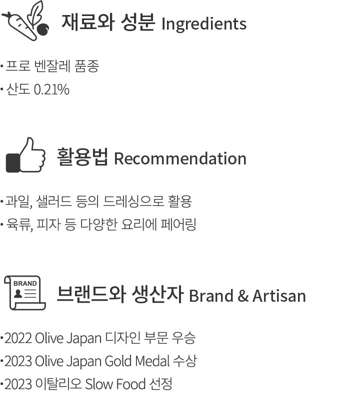 ・특징:프로 벤잘레 단일 품종으로 산뜻한 사과와 고소한 아몬드 향이 느껴지는 올리브 오일
