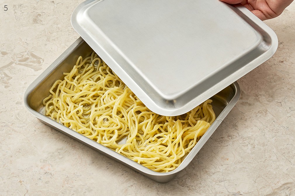 - 3.삶은 면의 물기를 완전히 뺀 뒤 뚜껑이 있는 냄비 또는 트레이로 옮겨 담아 주세요.