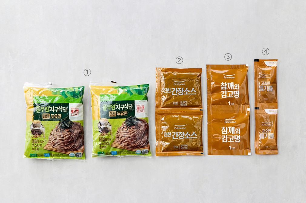 - 구성:①메밀두유면 2봉,②간장소스 2봉,③들기름 2봉,④참깨와 김고명 2봉