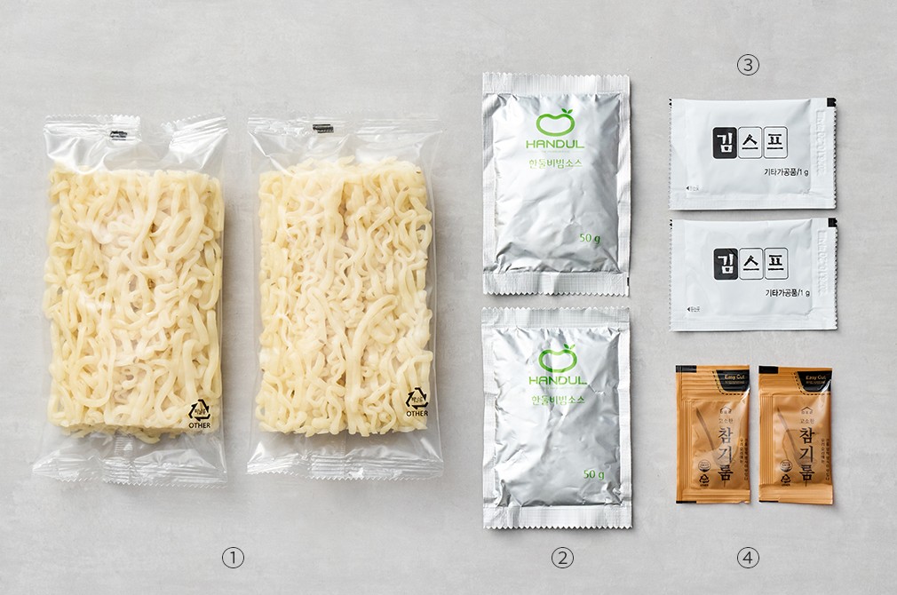 - 구성:①면(160g X 2봉),②소스(50g X 2봉),③참기름(3g X 2봉),④김 스프(1g X 2봉)