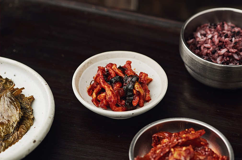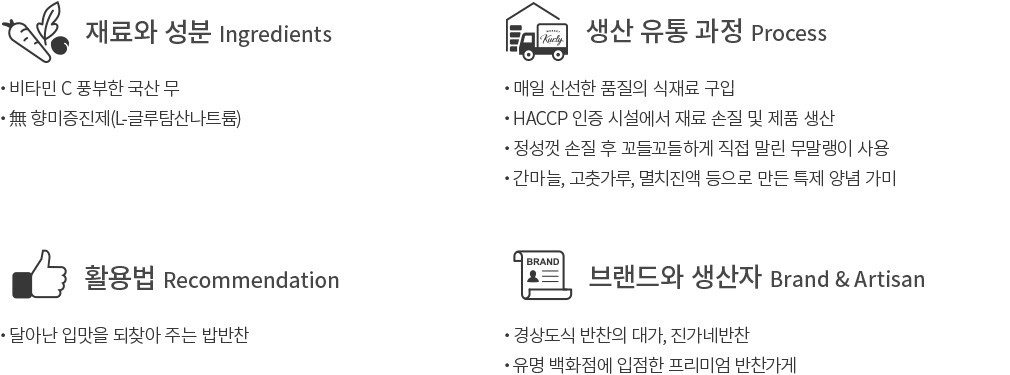 경상도에서 유난히 사랑받는 반찬으로는 무말랭이김치가 있어요. 무말랭이김치는 경상도에서 '오그락지','골곰짠지'로 불리며 김장철에 자주 등장하는데요. 무가 마르면서 주글주글하게 오그라든다고 하여 지어진 '오그락지'라는 예명은 무말랭이김치의 특징을 잘 보여주는 듯해요. 대구 출신인 진가네반찬이 지역색이 묻어나는 무말랭이김치를 놓칠 리 없습니다. 진가네는 정성껏 잘 말린 무를 소금에 절인 뒤,거뭇거뭇한 빛깔을 띠는 고춧잎을 함께 양념에 버무렸습니다. 양념장에는 멸치액젓이 사용되어,액젓으로만 낼 수 있는 깊고 진한 맛이 느껴지지요. 일반적인 무말랭이무침에 비해 진가네 무말랭이김치는 덜 질기고 부드러우며,양념 또한 촉촉하게 잘 스며 들어 있습니다.