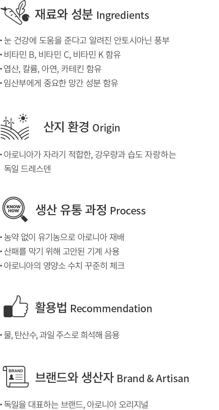보랏빛 아로니아 열매에는 안토시아닌,아연,카테킨,각종 비타민 등 우리 몸에 중요한 성분이 가득해요. 아로니아 중에서도 독일에서 생산된 아로니아가 최근 몇 년 사이 주목받는데요. 아로니아를 편하게 즐기실 수 있도록,독일 브랜드인 아로니아 오리지널의 대표 제품을 준비했습니다. 원액 제품은 착색료,보존료,향료 등을 넣지 않고 오직 신선한 아로니아를 그대로 착즙한 것으로,실제 아로니아의 풍미를 선사해요. 유기농 인증을 받은 제품이기에 더욱 믿음이 가지요. 처음 드시는 분들은 아로니아의 타닌 성분 때문에 떫다고 느끼실 수도 있습니다. 원액 자체를 먹기 힘들다면 물이나 탄산수,과일 주스에 넣고 희석해 드셔 보세요.