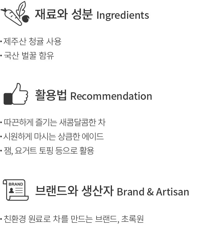 ・원재료:당침 청귤[청귤(제주산)50%,설탕] 60%,설탕,기타과당,정제수,사양벌꿀(국산) 2.5%,구연산,CMC,카라기난,혼합제제(감귤향)