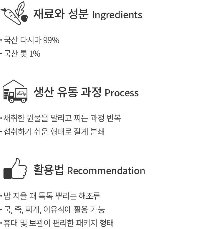 '바다의 채소'라고도 불리는 해조류,몸에 좋은 건 알고 있지만 자주 섭취하기 어려운 식재료이죠. 풍부한 영양소와 감칠맛을 품은 해조류를 더욱 쉽고 꾸준히 먹을 수 있는 방법을 소개할게요. 바로,밥 지을 때 톡톡 뿌려 넣기 좋은 해조류 플레이크랍니다. 국내에서 채취한 원물을 말리고 찐 후,먹기 좋은 크기로 잘게 분쇄했어요. 밥뿐만 아니라 찌개나 죽,이유식에도 요긴하게 활용할 수 있답니다. 특별한 밥을 짓고 싶다면,밥 지을 때 넣는 다시마를 지금 만나보세요.