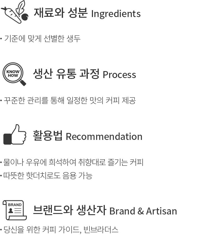 ・특징:곡물차를 연상시키는 고소한 향미에 낮은 톤의 산미가 은은한게 곁들여진 콜드브루 원액이에요. 약간의 단맛이 더해져 훌륭한 밸런스를 이룹니다.