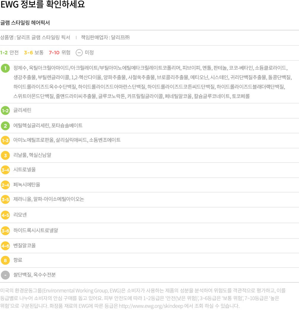 EWG에 대한 컬리의 생각 컬리는 화장품,샴푸,치약,세제 등 우리의 인체에 닿는 리빙 제품의 전성분을 공개하고 성분의 위험 정도를 EWG 기준에 따라 1~10 숫자로 안내하고 있습니다. EWG가 세계적으로 널리 사용되는 신뢰할 수 있는 척도인 것은 맞지만,상품의 안전성을 증명하는 절대적인 기준은 아니에요. EWG로부터 좋지 못한 평가를 받은 성분에 대해 전문가와 유관기관은 '권고 기준치를 지켜 사용할 경우 무해하다'고 평가하기도 합니다. 이에 컬리는 EWG 등급과 인터넷에 떠도는 단편적인 정보에만 의존하지 않고 식품의약품안전처,에코서트(ECOCERT),미국식품의약국(FDA),미국화장품원료검토위원회(CIR)등 공신력 있는 인증기관의 의견을 참고하여 유해성 여부를 꼼꼼하게 따져 보고 있습니다.