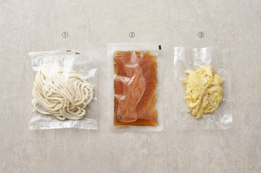 튀김 우동・구성 :①카덴 우동면(180g),②카덴 우동 소스(100g),③카덴 양파우엉 튀김(40g)