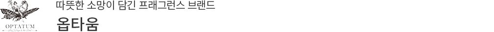 옵타움(OPTATUM)은 라틴어로 '소망'이라는 뜻이에요. 옵타움은 모든 사람들에게 향기로운 일상을 선물하고 싶다는 소망을 담아 탄생한 프래그런스 브랜드이죠. 섬세하게 블렌딩하여 완성한 다양한 향을 선보이고 있는데요. '나의 향기 찾기' 서비스를 통해 각자의 성향에 맞는 향기를 찾을 수 있도록 돕기도 해요. 19세기 영국에서 영감을 받은 럭셔리 빈티지 컨셉의 디자인도 돋보이죠. 옵타움의 감각적인 향과 함께 일상에 특별함을 더해보세요.