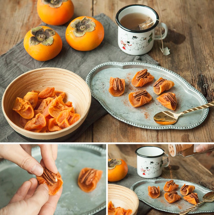 RECIPE 1. 감말랭이의 옴폭한 부분에 피칸을 하나씩 넣고 잘 오므린다.