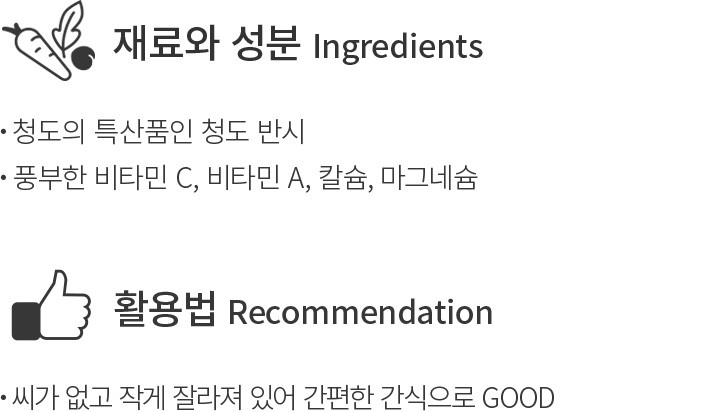 겉은 꼬들꼬들하고 속은 쫀득한 천연 젤리 청도의 특산품인 청도 반시 중에서도 질 좋은 반시를 선별하여,꼭지 부분을 도려낸 후 먹기 좋은 크기로 3~4등분 한 뒤 건조시킨 감말랭이입니다. 건조과정에서 일정 수준의 수분을 남겨 두어 겉은 꼬들꼬들하고 속은 촉촉해서 식감도 좋지요. 청도 반시의 특성상 씨가 없고 작게 잘라져 있어 사계절 내내 간식으로 간편하게 먹을 수 있습니다.