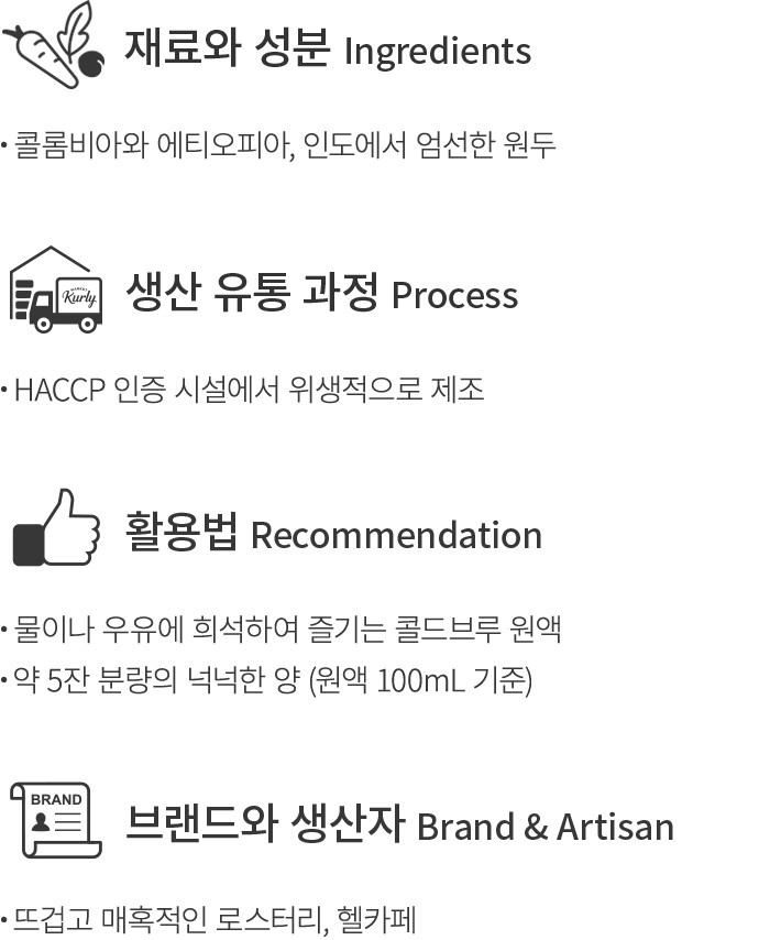 두 명의 바리스타가 선보이는 진한 여운,헬카페의 커피를 콜드브루로 손쉽게 즐겨 보세요. 콜롬비아와 에티오피아,인도에서 엄선한 원두를 강배전으로 로스팅했어요. 산미가 있는 스페셜티 커피와 달리,원두 본연의 강렬하고 묵직한 풍미가 돋보이지요. 원액 제품이라 물이나 우유에 희석하기만 하면 깊은 맛의 커피를 간편하게 즐길 수 있고요. 바닐라 아이스크림 등에 곁들여 콜드브루 아포가토로 드셔도 훌륭할 거예요. 진하고 쌉싸름한 커피를 좋아하는 분들께 추천할게요.
