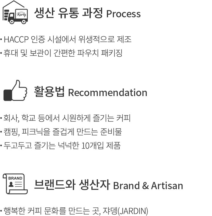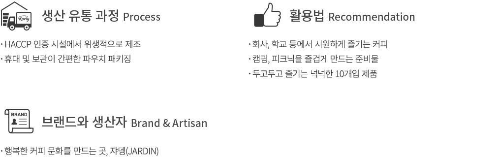 쟈뎅만의 블렌딩 노하우가 돋보이는 시그니처 아메리카노를 소개할게요. 과테말라와 브라질,베트남산 원두를 사용해 만든 제품이랍니다. 향긋하면서도 깔끔하게 마무리되는 맛으로,부담 없이 즐기기 좋아요. 넉넉한 10개입이라 사무실 등에 구비해 두기에도 제격이고요. 한 번에 마시기 좋은 용량으로 파우치에 담았으니,가방이나 서랍에 하나씩 넣어 두기에도 좋을 거예요.