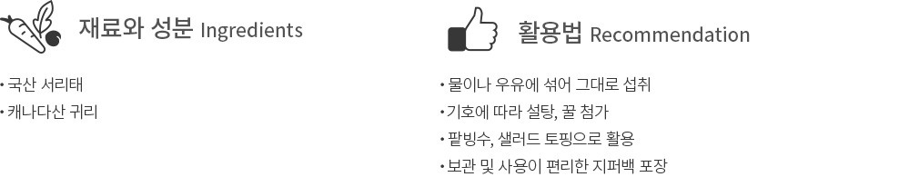 섭취법?40~50g(2큰술)을 물 또는 우유 200mL에 타서 잘 섞어 드세요. 기호에 따라 꿀이나 설탕 등을 가미하여 드시면 더욱 맛있습니다.