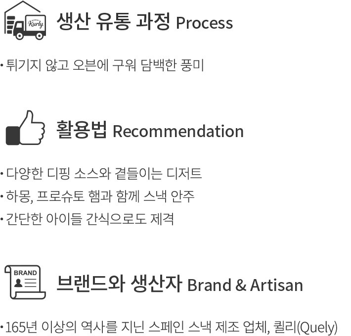 1853년부터 다양한 스페인 전통 스낵을 선보여온 퀼리가 이번에는 원재료 본연의 맛이 살아 있는 치즈 브래드스틱을 준비했습니다. 스페인산 밀가루와 식물성 오일을 베이스로 튀기지 않고 오븐에 구워냈기에 담백한 맛이 두드러지는데요. 부드럽게 바스러지는 식감이라 아이들에게 부담 없이 건네기에도 제격이고요. 치즈의 고소한 맛이 깊게 배어 들어 있어,와인에 곁들이는 간단한 안주로도 훌륭하답니다. 취향에 맞는 소스나 치즈,햄 등을 곁들이면 담백한 스낵의 무한한 변주를 경험할 수 있을 거예요.