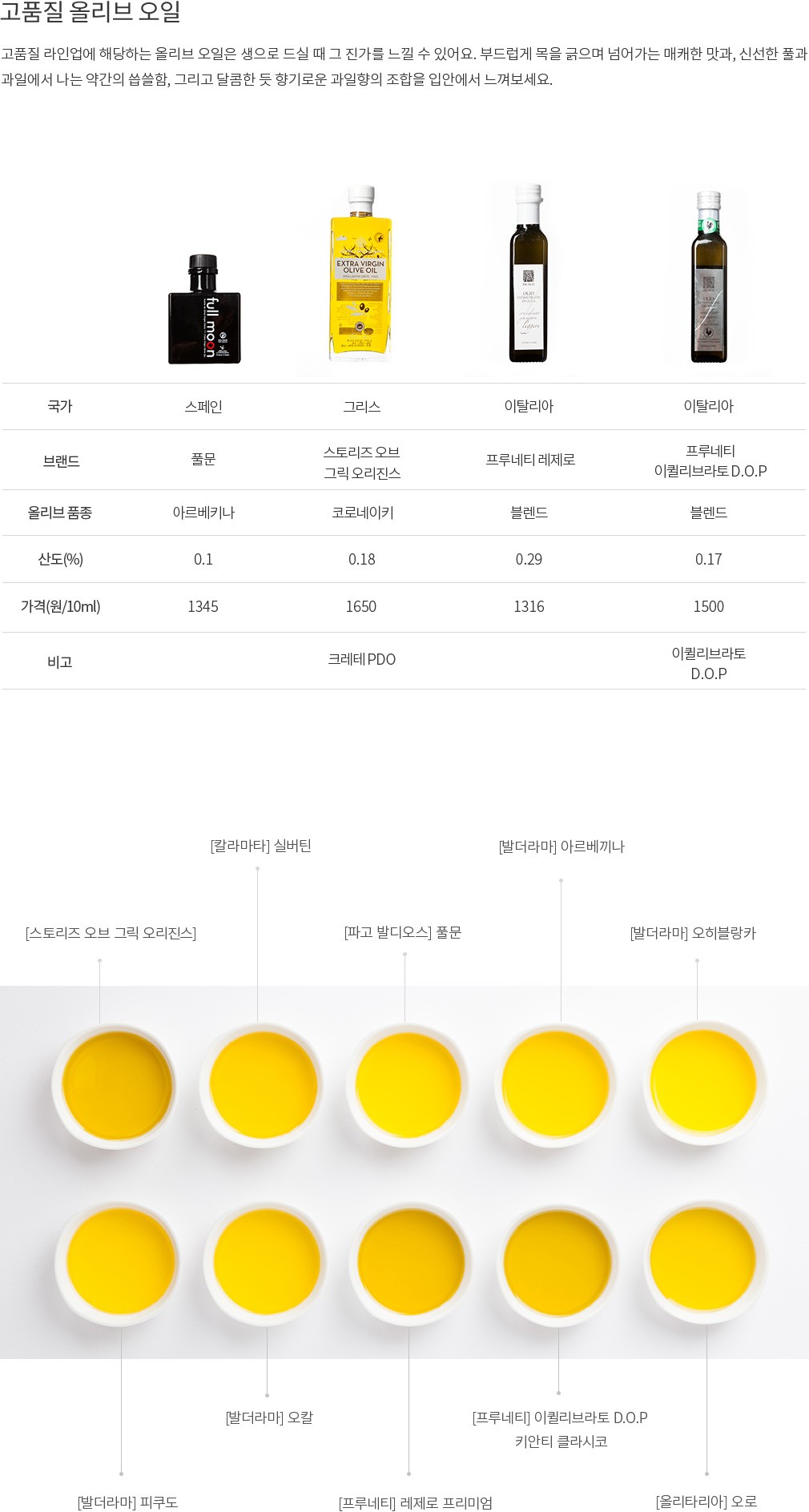 풍부한 맛을 선사하는 풀문(Full Moon) 아르베키나 품종의 올리브는 열매가 작아 기계로 수확하는 대신 손으로 하나하나 수확합니다. 아르베키나로 압착한 올리브 오일은 풍부한 맛을 가지고 있으며 과일 향이 뛰어나지요. 컬리에서는 파고 발디오스 산 카를로의 아르베키나 품종을 준비했는데요. 파고 발디오스 산 카를로는 17세기부터 포도와 올리브를 생산해온 가문입니다. 스페인 동중부 티에타 밸리의 신선한 계곡물과 특유의 기후로 인해 다른 지역보다 15일 정도 올리브를 더 일찍 수확하지요. 덕분에 '풀문' 엑스트라 버진 올리브 오일은 훨씬 강하고 짙은 과일 향을 자랑해요. 게다가,올리브를 수확한 즉시 압착해내어 0.1% 이하로 산도를 낮춰 달콤한 올리브유의 풍미를 느낄 수 있지요. 재료 본연의 맛을 해치지 않으면서 풋풋하고 신선한 향을 입안에 꽉 채워주기 때문에 생채소나 익힌 채소와 잘 어울리며,생선구이를 하기에도 적합한 오일이에요.