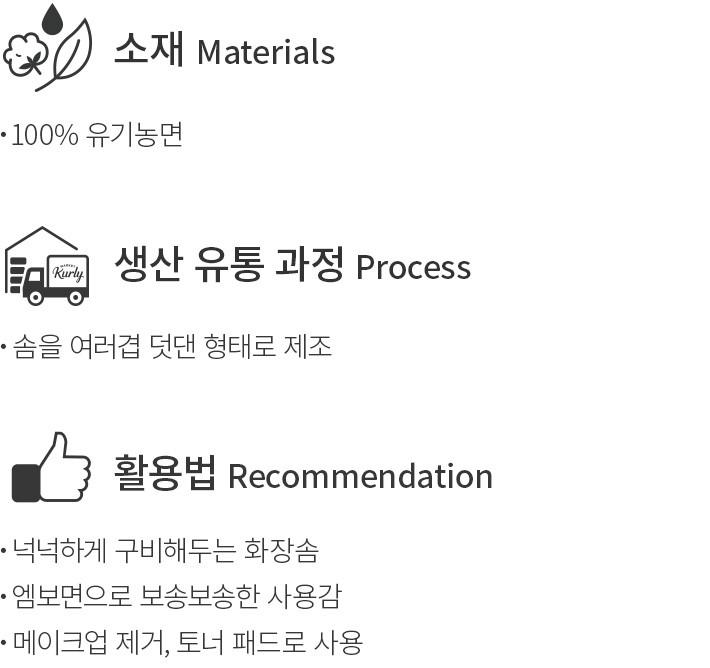・ 특징:메이크업을 닦아내거나,세안 후 토너로 피부결을 정돈할 때 쓰기 좋은 화장솜이에요.