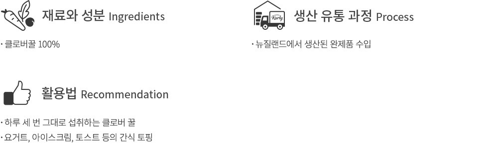 뉴질랜드의 양 브랜드,콤비타는 마누카 꿀을 비롯해 다채로운 종류의 꿀 상품들을 선보이고 있지요. 이번에는 클로버 꽃으로부터 꿀벌들이 채취한 클로버 꿀을 준비했어요. 클로버만의 향긋한 풍미와 우아한 단맛이 아주 매력적인 제품이랍니다. 크림화 공정을 거쳐 아주 부드러운 질감을 자랑하죠. 하루 세 번,공복에 조금씩 챙겨 보세요. 다양한 간식에 잼 대신 활용하거나,음료를 만들때에 첨가하기에도 참 좋을 거예요.