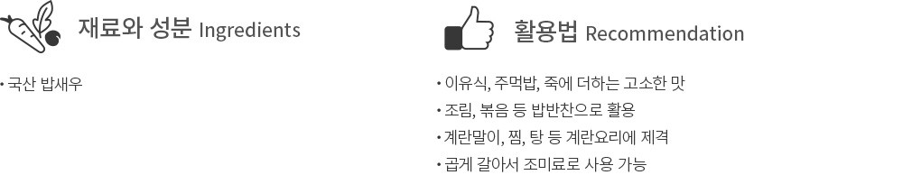 요리에 두루 활용하기 좋은 삼천포 밥새우를 소개합니다. 남해안 삼천포에서 어획한 밥새우를 알맞게 데치고 말렸어요. 크기가 매우 작고 부드러워서 죽이나 이유식에 쓰기 딱 알맞고요. 계란말이,계란찜,볶음밥 등에 넣으면 고소한 맛과 영양을 더해주지요. 주먹밥 재료로 사용하거나 곱게 갈아서 감칠맛을 더하는 조미료로 활용해도 좋답니다. 지퍼백에 담겨 있으니 원하는 만큼 사용 후 간편하게 보관할 수 있을 거예요.