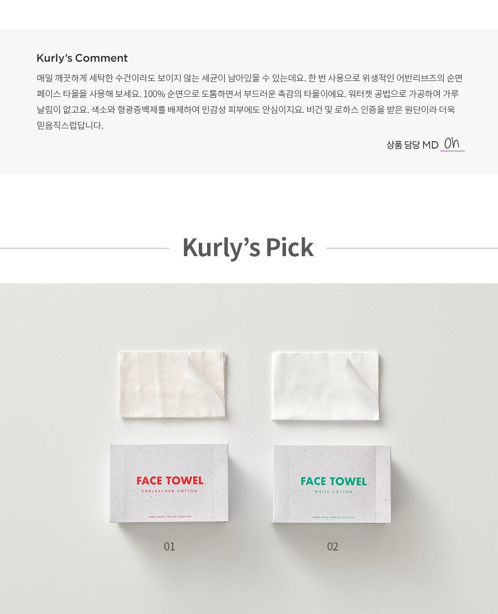 01~02. 순면 페이스 타올・ 선택 가이드:①무표백,②화이트 중 선택하세요.