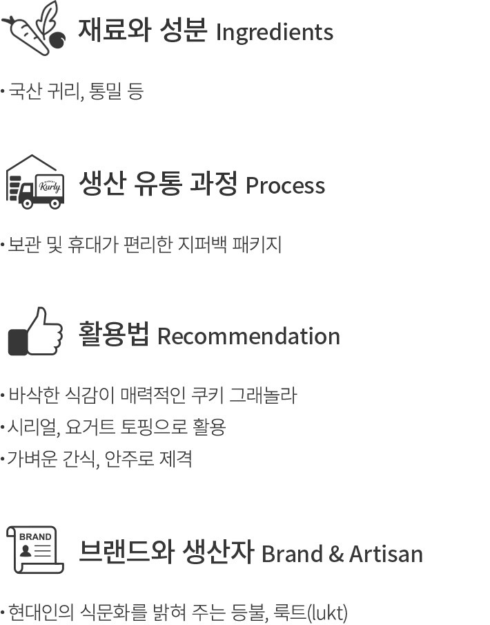 ?특징:귀리와 아몬드에 무염 버터,인절미 가루,코코넛 슈가 등을 더해 만든 그래놀라입니다. 아이스크림이나 빙수 토핑으로 잘 어울려요.