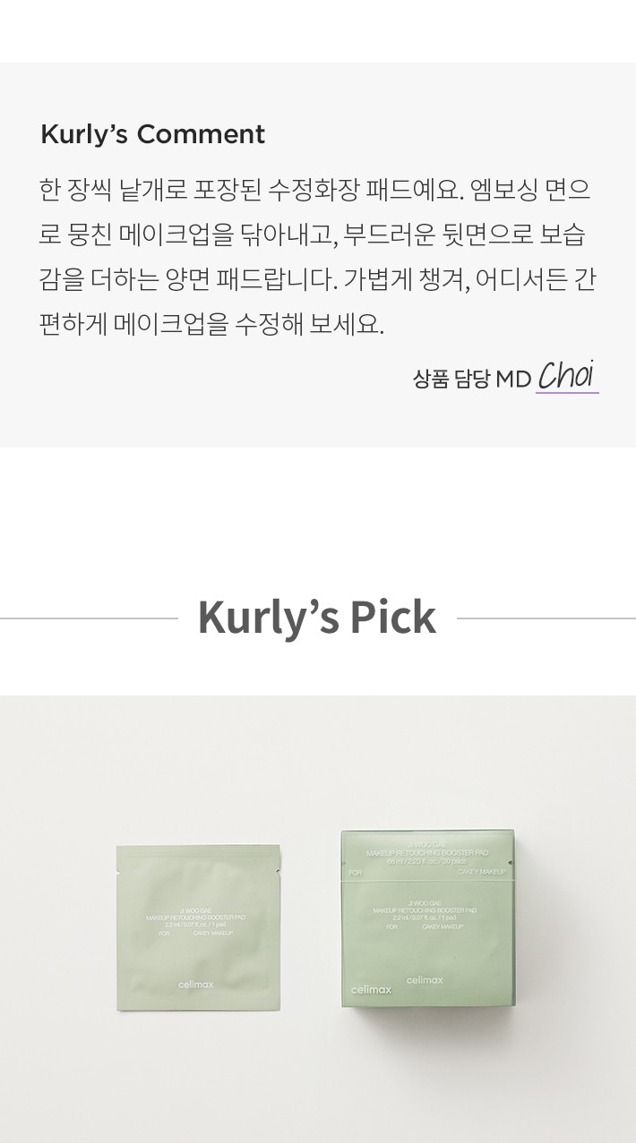 ? 특징:메이크업을 부분적으로 지워내고,촉촉한 수분감을 더해주는 양면 수정 패드입니다.