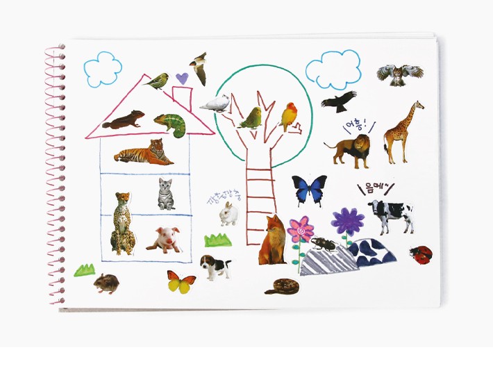 남는 스티커를 활용하세요 ?놀이를 모두 끝낸 후에 남는 스티커를 활용해보세요. 동화책이나 스케치북에 붙이면서 새롭게 상상의 나래를 펼칠 수 있어요.