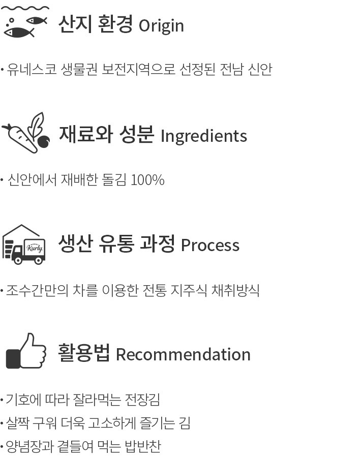 곱창김은 1년 중 약 30일 동안만 생산되는 귀한 김이에요. 김 모양이 꼬불꼬불한 곱창을 닮아 오독오독 씹는 맛이 살아있지요. 예맛의 곱창돌김은 전통 *지주식 양식으로 기른 돌김으로 만들었습니다. 전라남도 신안군의 햇살과 바람을 충분히 받고 자라,향과 풍미가 살아있어요. 씹을수록 단맛이 돌고 김 특유의 고소함이 진하게 느껴진답니다. 그대로 담백하게 드시거나 살짝 구워 한층 더 고소하게 즐겨 보세요.