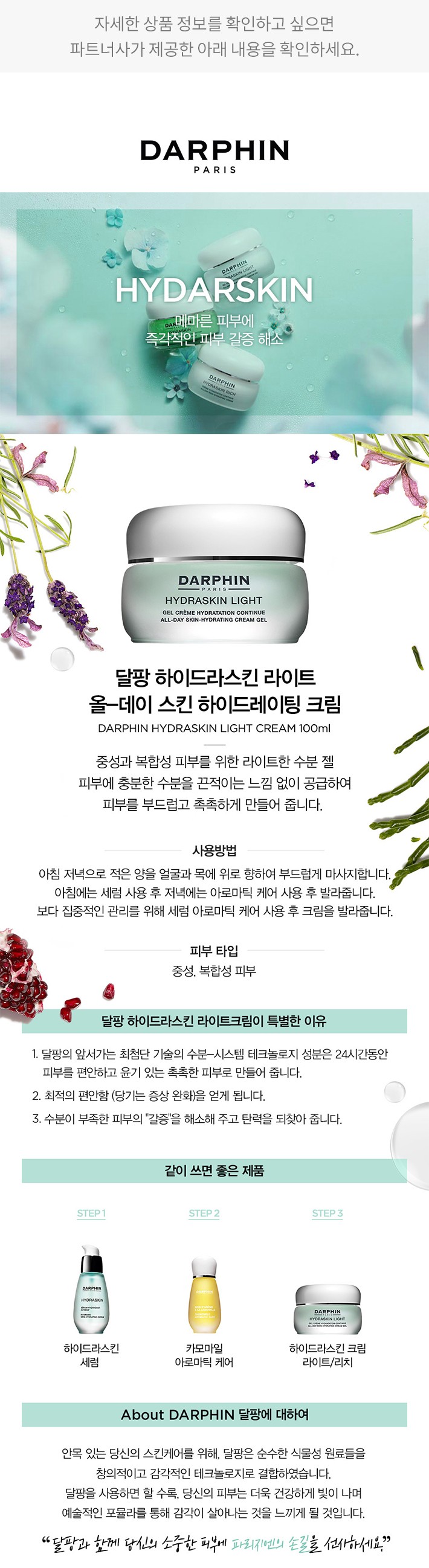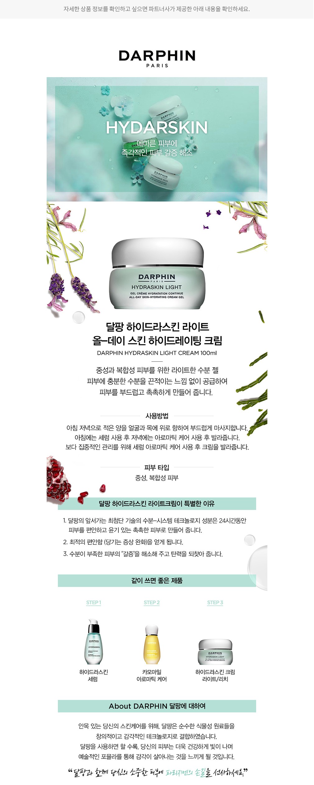 추천 루틴・달팡의 카모마일 아로마틱 케어와 함께 사용해 보세요. 보다 농밀한 보습감을 느낄 수 있습니다.