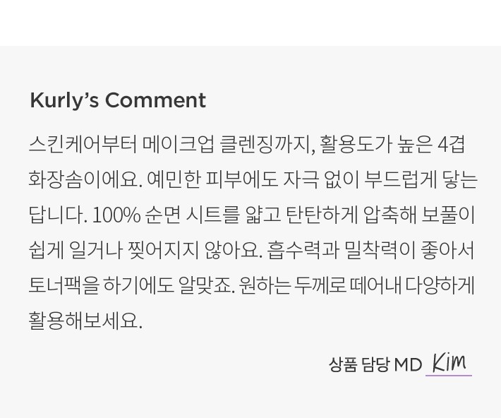 ・특징:100% 순면 시트를 탄탄하게 압축해 완성한 4겹 화장솜입니다.