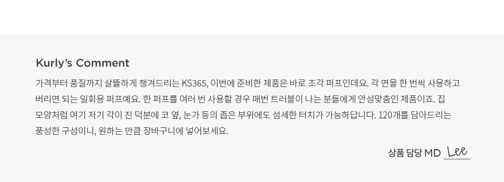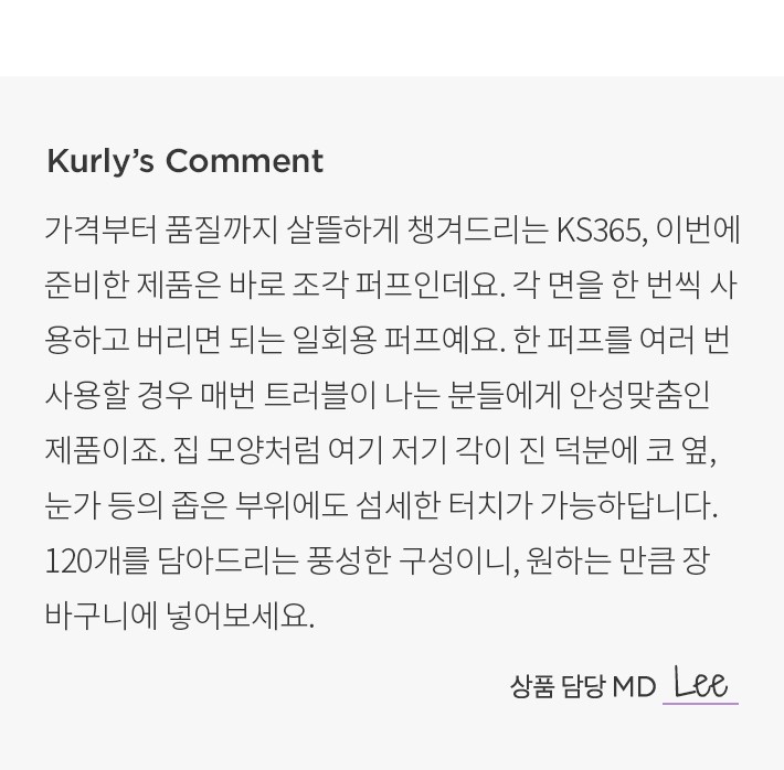 ・ 특징:파운데이션,크림 블러셔 등을 바를 때 사용할 수 있는 조각 퍼프입니다. 한 면씩 사용하고 버리면 되는 일회용 제품이라 더욱 위생적이에요.