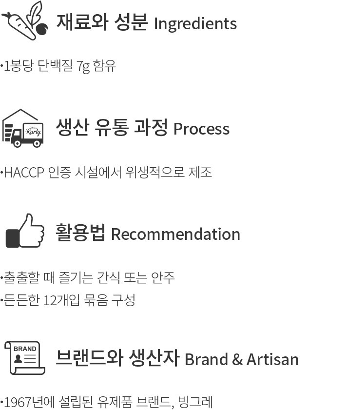 빙그레가 선보이는 단백질 전문 브랜드,더단백의 팝칩으로 맛있게 단백질을 채워 보세요. 고소한 옥수수 분발에 건조 닭가슴살 분말을 더해 완성한 단백질 스낵이랍니다. 기름에 튀기지 않고 공기로 구워 더욱 깔끔하고 바삭한 식감을 자랑해요. 1봉당 단백질이 7g 함유되어 있는 것은 물론,필수 아미노산 9종도 함유하고 있지요. 입이 심심한 순간 가볍게 즐기는 간식으로 선택해보세요. 12개입 묶음 구성이니 두고두고 즐기기에도 참 좋을 거예요.