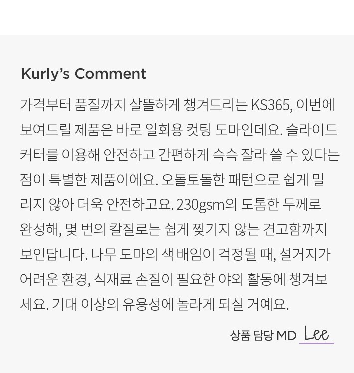 ・ 특징 :단독으로 사용하거나 도마 위에 깔아 쓸 수 있는 일회용 도마입니다. 슬라이드 커터를 이용해 안전하고 쉽게 필요한 만큼 잘라낼 수 있어요.