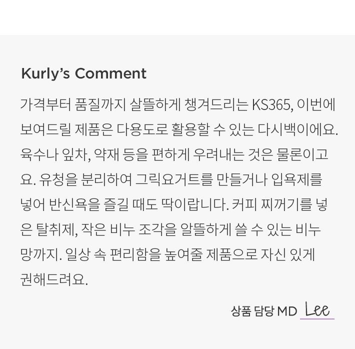 ?특징 :일상 속 다양하게 쓰일 수 있는 다시백입니다. 각종 식자재를 우리는 것은 물론 내용물을 넣어 입욕제나 탈취제로도 활용 가능해요.